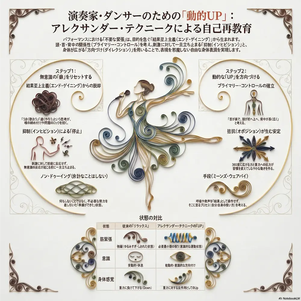 声楽家やダンサー、及びその指導者に対し、「プライマリーコントロール」や「拮抗」の概念を、単なるリラックスではなく必要最小限の力で「up」を保つ動的な状態として再定義する。指導現場において、生徒が「無意識の不必要な緊張」を「方向づけ」によっていかに改善できるか、その理論的背景と観察の視点を提供することを目的とする。